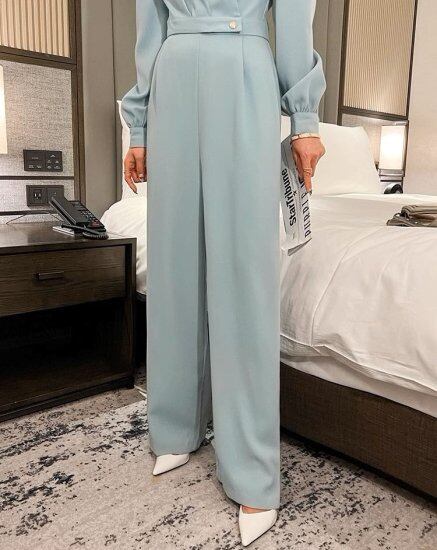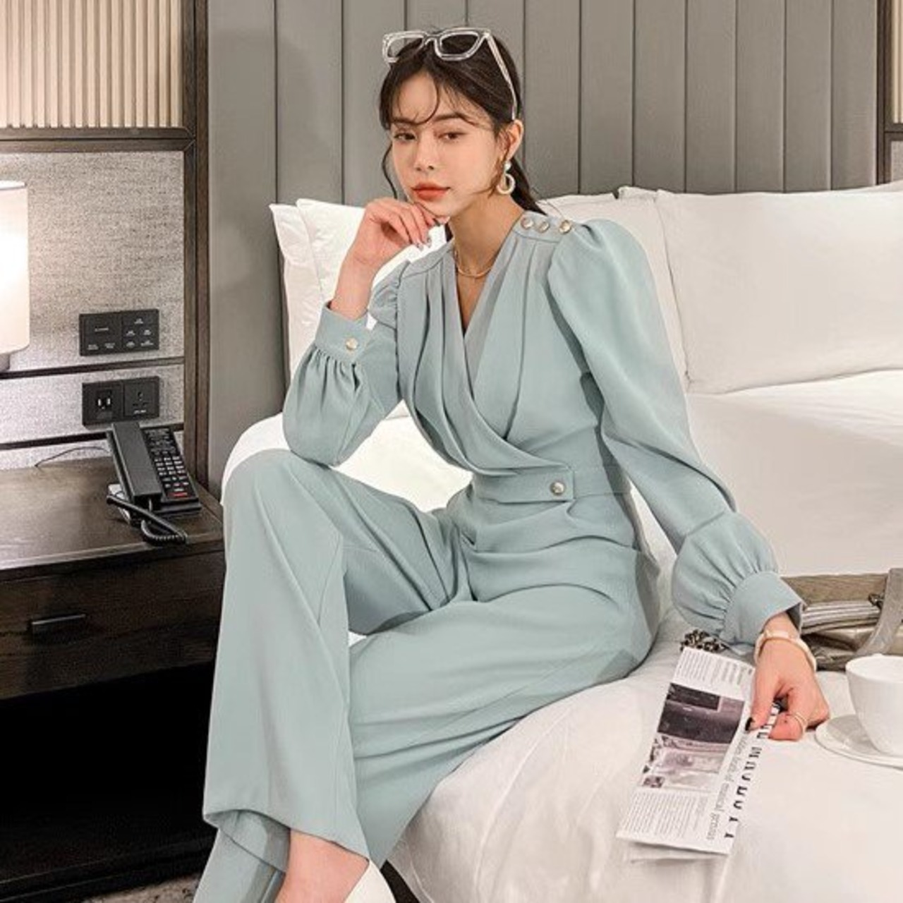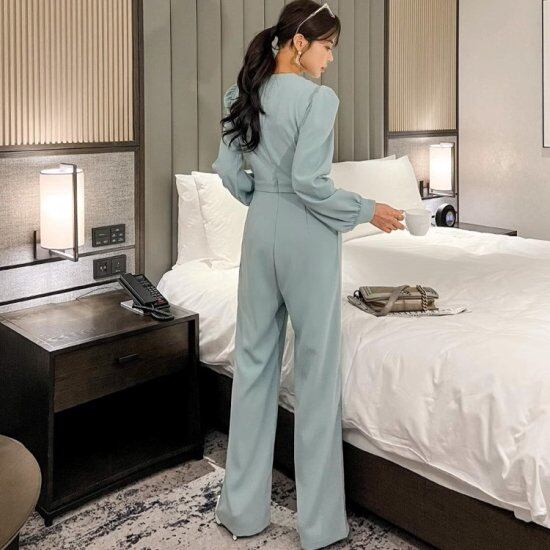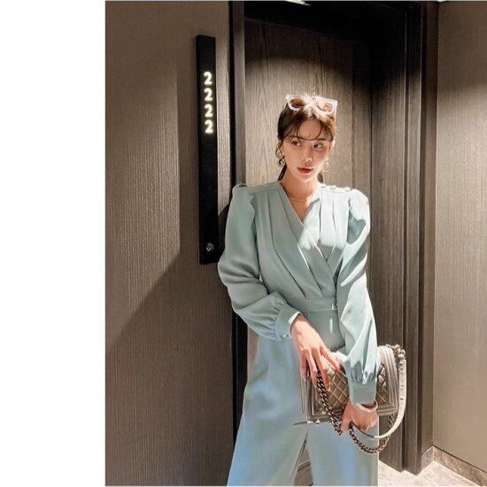 パンツドレス レディース オールインワン Vネック カシュクール ワイドパンツ ジャンプスーツ ハイウエスト 長袖 パフスリーブ ドレープ レトロ クラシカル きれいめ パーティー おしゃれ