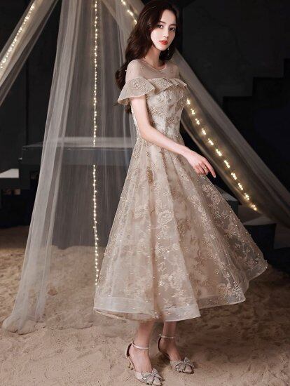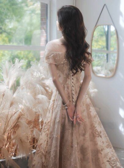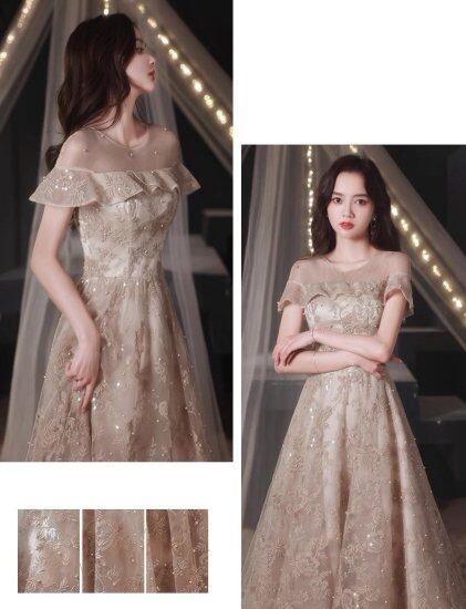 結婚式ドレス レディース オフショルダー レースワンピース ミモレ丈 ミディアム丈 ロング丈 パール ビーズ Aライン 華やか フェミニン きれいめ 演奏会 二次会 謝恩会 パーティー おしゃれ