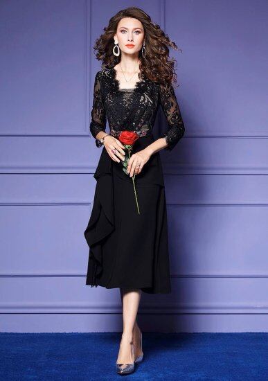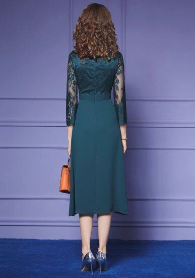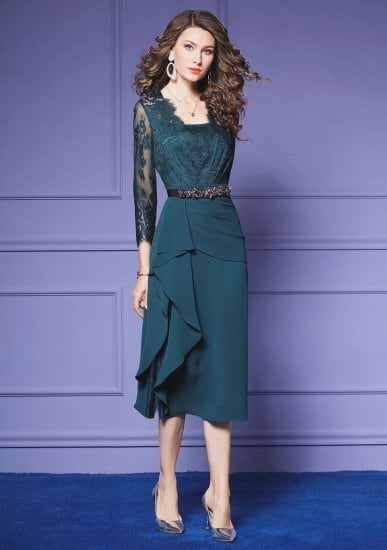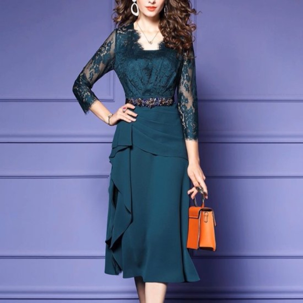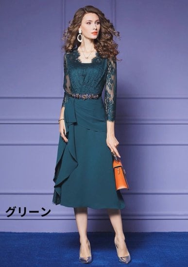 結婚式ドレス レディース レースワンピース アシンメトリー スクエアネック 長袖 透け感 ハイウエスト ミディアム丈 ミモレ丈 きれいめ エレガント 演奏会 二次会 謝恩会 パーティー おしゃれ