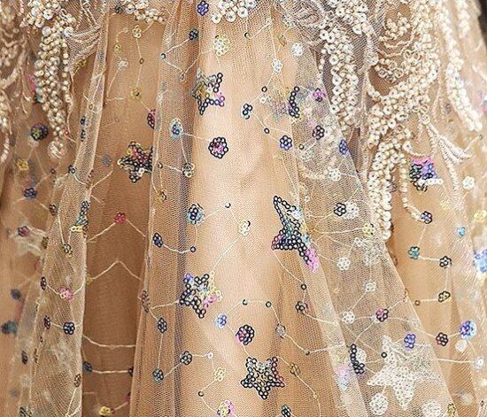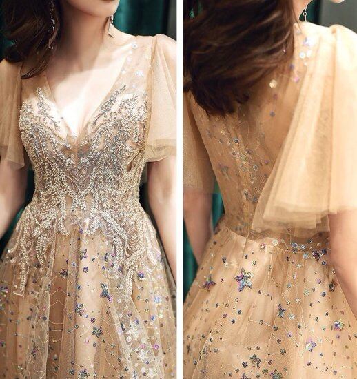 パーティードレス レディース Vネックワンピース スパンコール レース袖 フィッシュテール ドレス 半袖 チュール袖 ゴージャス 星柄 華やか エレガント 演奏会 ステージ衣装 結婚式 おしゃれ