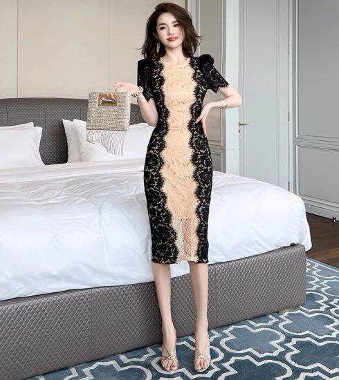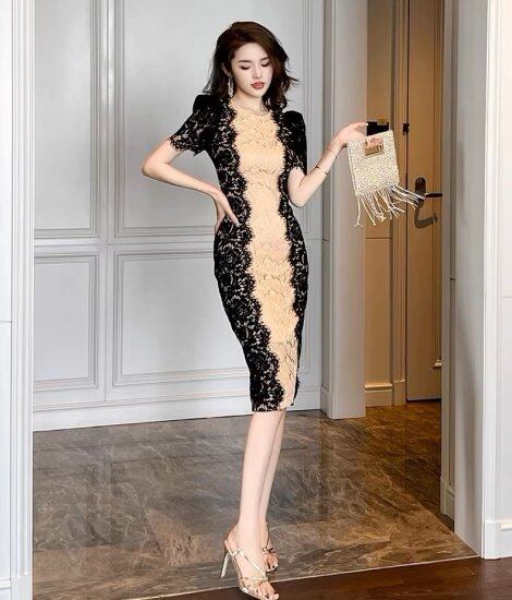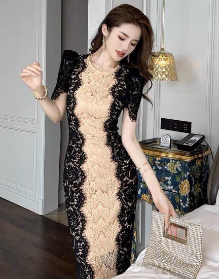 パーティードレス レディース レースワンピース バイカラー 配色ワンピース タイトワンピース ひざ丈 ミモレ丈 ロング丈 総レース スリム エレガント 華やか 結婚式 演奏会 二次会 おしゃれ