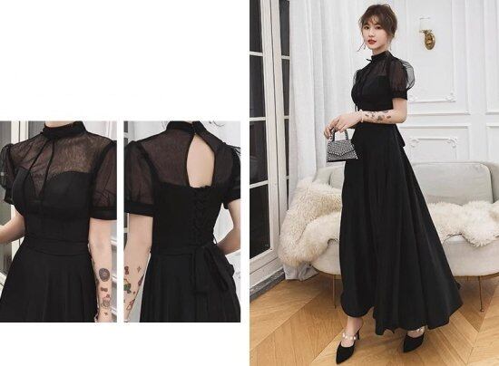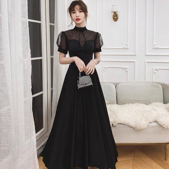 結婚式ドレス レディース パフスリーブ 半袖 スタンドカラー 透け感 シースルー ロングドレス ロングワンピース Aライン エレガント 演奏会 二次会 披露宴 謝恩会 パーティー イブニングドレス