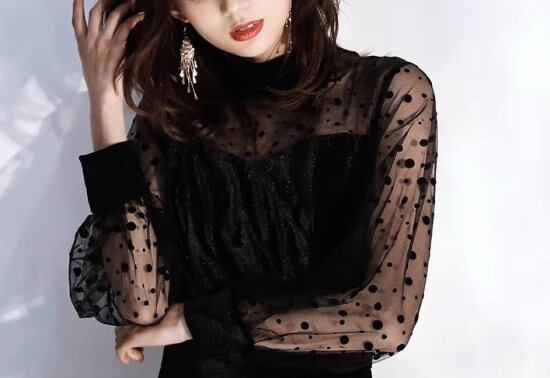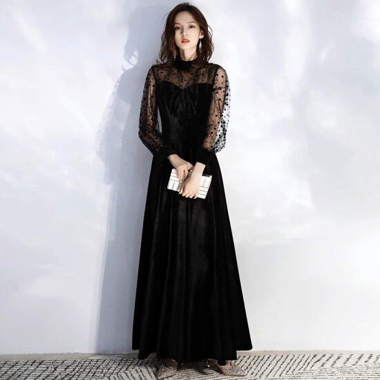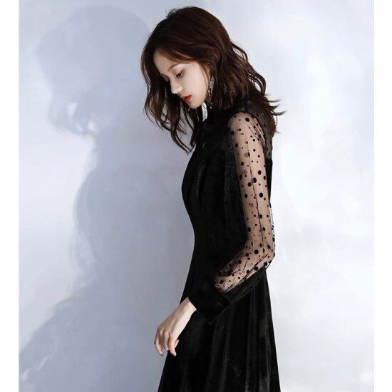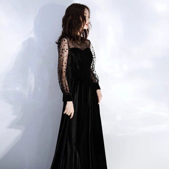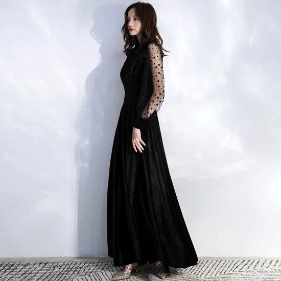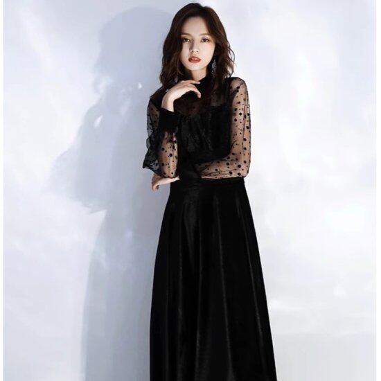 パーティードレス レディース シアースリーブ ドット柄 水玉レース ロングドレス ランタンスリーブ マキシ丈 ベルベット 水玉 結婚式 演奏会 二次会 披露宴 パーティー イブニングドレス おしゃれ