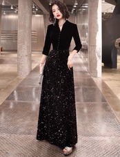 演奏会ドレス レディース パーティードレス 結婚式ドレス ワンピースドレス ロングドレス Vネック スパンコール きらきら きれいめ エレガント ハイウエスト Aラインスカート お呼ばれ 二次会