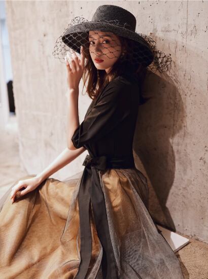上下の切り替えがおしゃれなロングドレス。