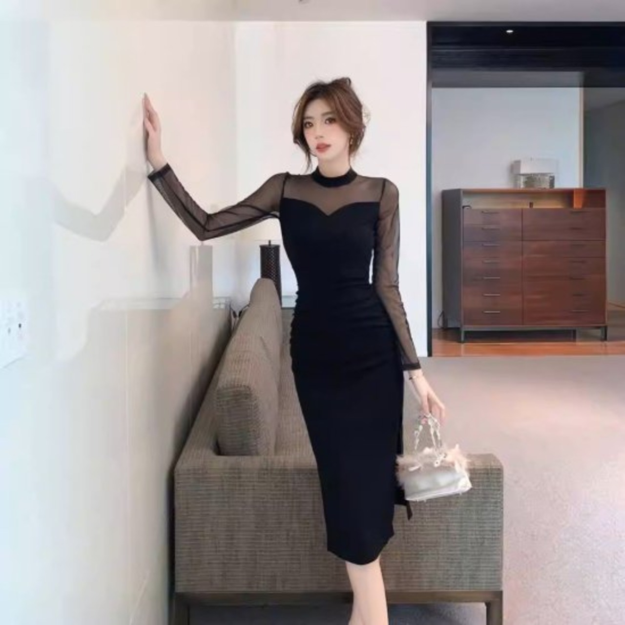 シアー素材と深いスリットがセクシーでエレガントなワンピースドレス。