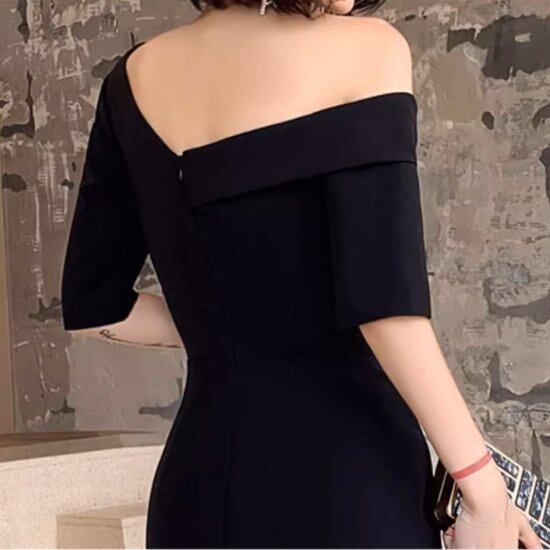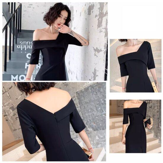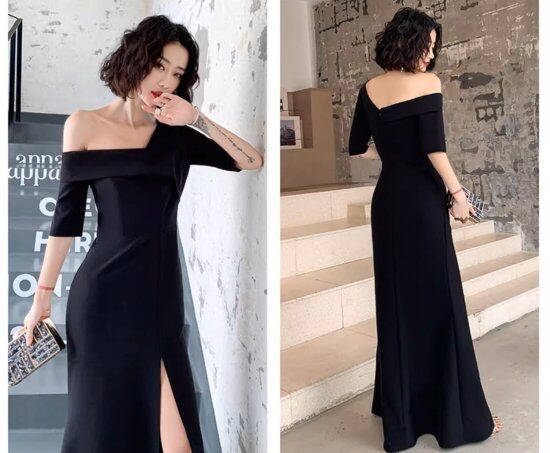 アシンメトリーデザインがおしゃれなブラックロングドレス。