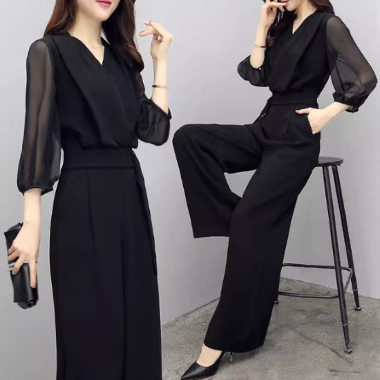 ジャンプスーツ レディース パンツドレス オールインワン ワイドパンツ ウエストベルト Vネック ハイウエスト シースルー袖 きれいめ エレガント スタイリッシュ 結婚式 パーティー お呼ばれ 女性