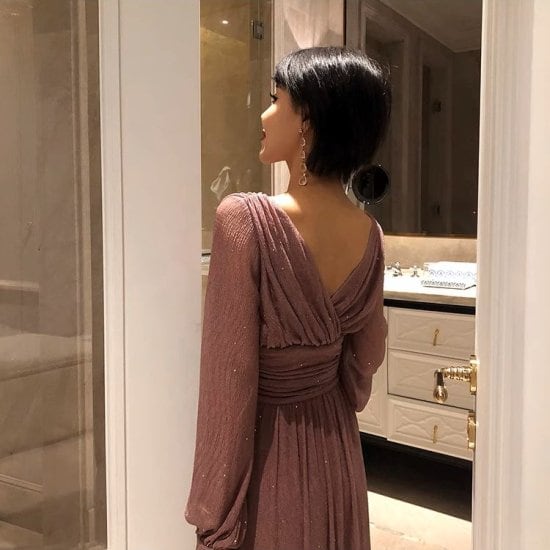 美しいドレープとキラキラが華やかなロングドレス。