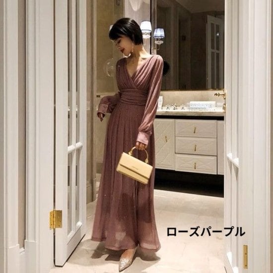 演奏会ドレス レディース ロングドレス Vネック 長袖 Aライン ロング丈 マキシ丈 ハイウエスト ドレープ クラシカル シースルー 華やか セクシー 3color 結婚式 披露宴 謝恩会 おしゃれ
