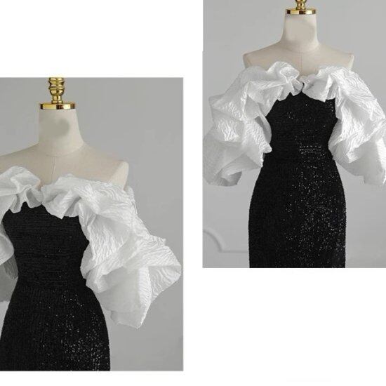 演奏会ドレス レディース パーティードレス オフショルダー フリル袖 ボリューム ロングドレス タイト スリム グリッター 肩出し エレガント イブニングドレス 結婚式 披露宴 謝恩会 おしゃれ