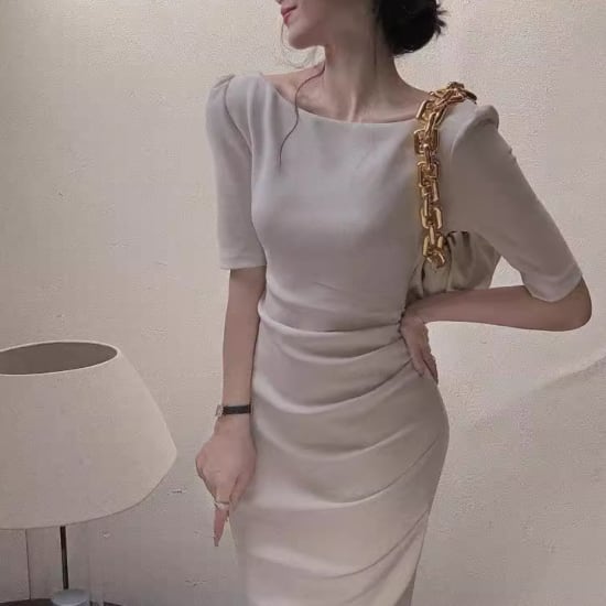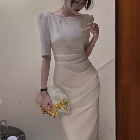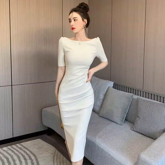 パーティードレス レディース タイトワンピース 半袖 バックオープン 背中開き ボートネック ラウンドネック スリム ロング丈 ミモレ丈 シンプル エレガント 結婚式 二次会 パーティー おしゃれ