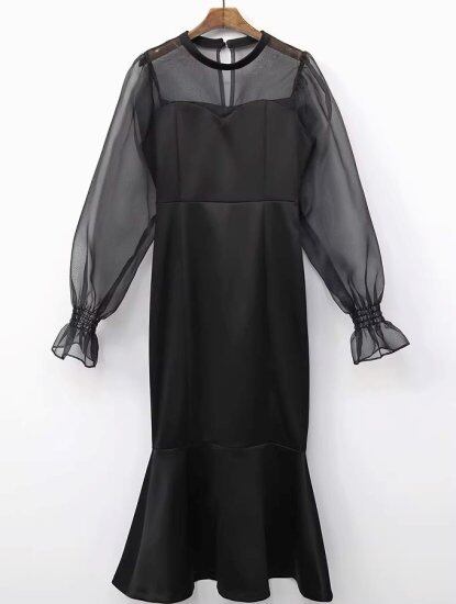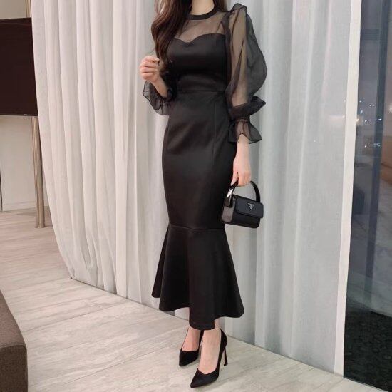 パーティードレス レディース マーメイド 結婚式ドレス 演奏会ドレス ワンピース シアースリーブ ボリューム袖 シースルー レース フィッシュテール ロング エレガント 謝恩会 披露宴 おしゃれ