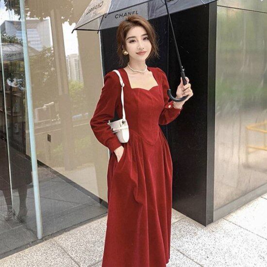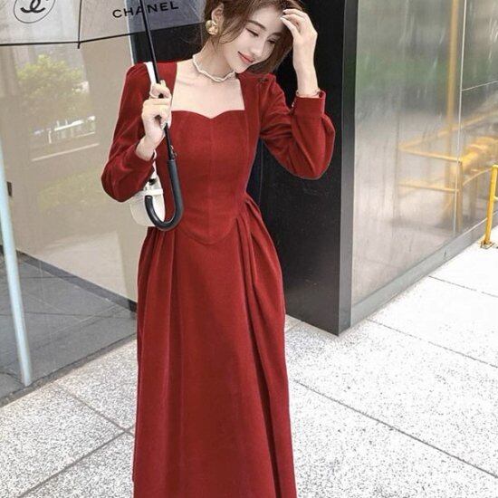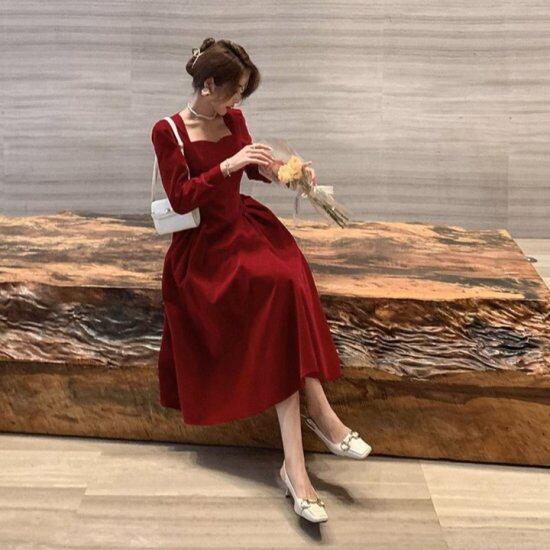 パーティードレス レディース Aラインワンピース ベルベット 長袖 ハートネック スクエアネック ハイウエスト ミモレ ロング エレガント 結婚式 演奏会 披露宴 謝恩会 二次会 ベロア おしゃれ