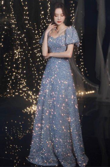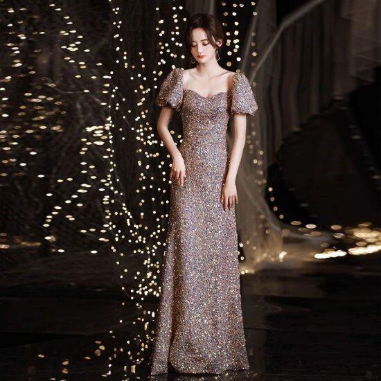 演奏会ドレス レディース パーティードレス スパンコール パフスリーブ 半袖 オフショルダー ロングドレス キラキラ スクエアネック エレガント 結婚式 披露宴 謝恩会 3color おしゃれ