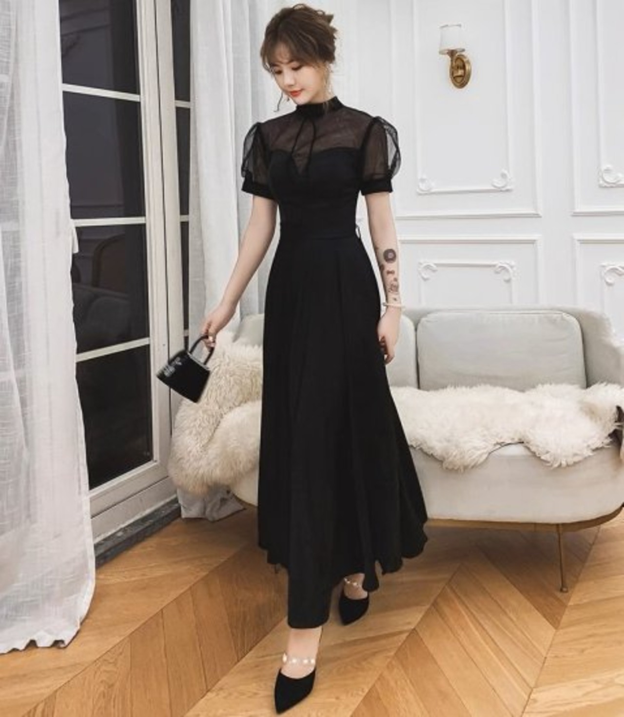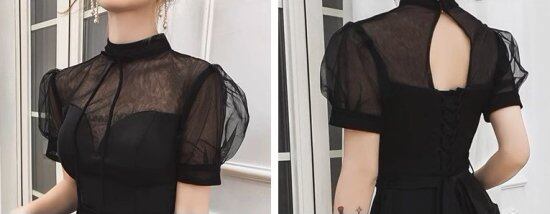 パーティードレス レディース 演奏会ドレス パフスリーブ 半袖 スタンドカラー シースルー シアースリーブ ロング マキシ エレガント 結婚式 披露宴 謝恩会 二次会 パーティー 黒 おしゃれ