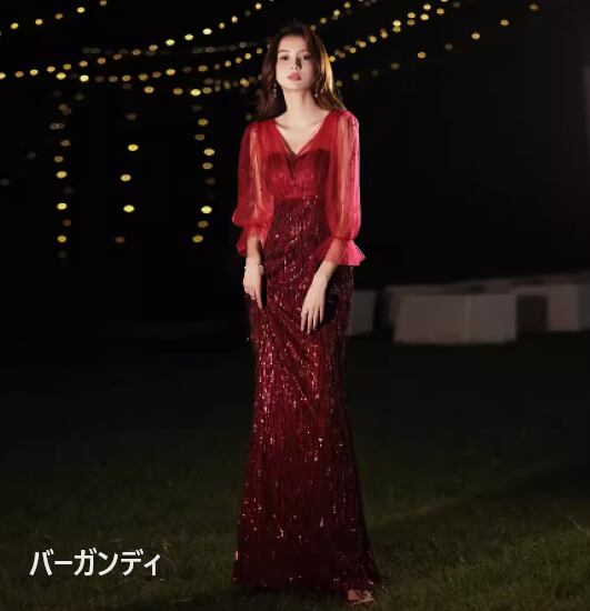 演奏会ドレス レディース パーティードレス 結婚式ドレス ワンピースドレス ロングドレス ロングワンピース Vネック ハイウエスト シースルー パール スパンコール きらきら 華やか ゴージャス