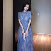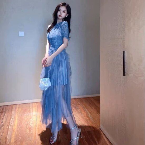 パーティードレス レディース レース 半袖 ティアードスカート チュールレース シースルー 透け感 シアー ロング ミモレ エレガント 華やか 結婚式 演奏会 謝恩会 披露宴 二次会 おしゃれ