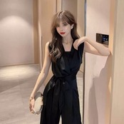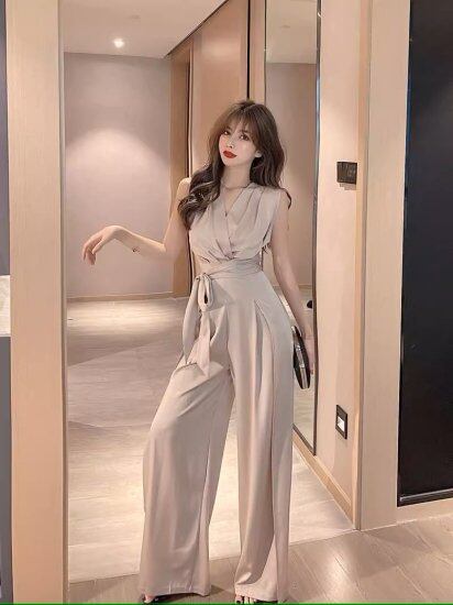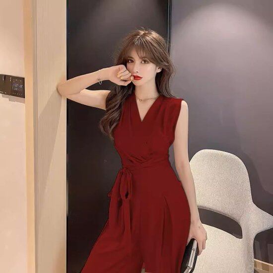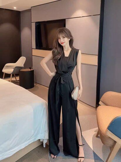 パンツドレス レディース オールインワン Vネック ノースリーブ ウエストリボン カシュクール スリット きれいめ エレガント 華やか セクシー ジャンプスーツ パーティー 謝恩会 演奏会 おしゃれ