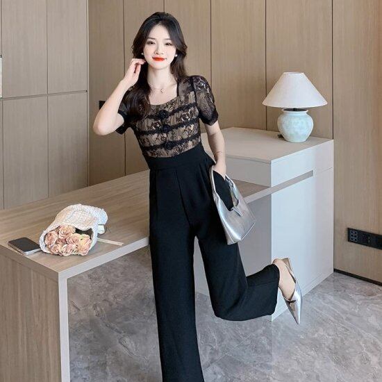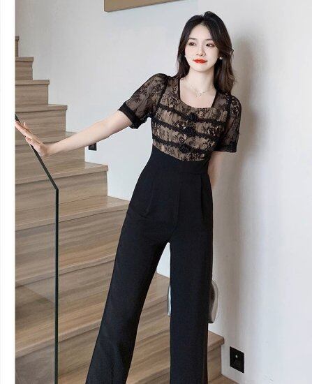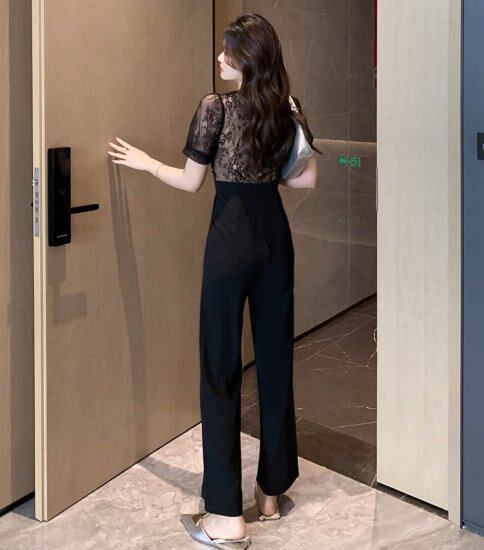 パンツドレス レディース オールインワン レース 異素材ミックス 半袖 ワイドパンツ ハイウエスト 花柄レース 黒 ドレス ワンピース エレガント 上品 結婚式 披露宴 謝恩会 パーティー おしゃれ