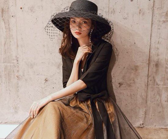 ブラックのチュールレースがエレガントなロングドレス。