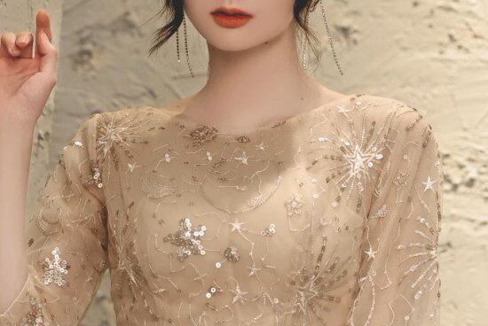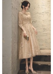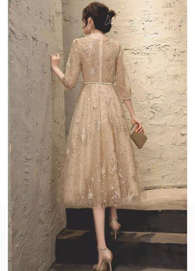 パーティードレス レディース レースワンピース 長袖 七分袖 刺繍 レース ミモレ丈 ロング丈 キラキラ 星 月 レトロ エレガント 結婚式 披露宴 演奏会 謝恩会 イブニングドレス おしゃれ