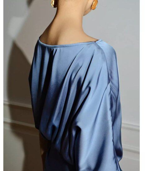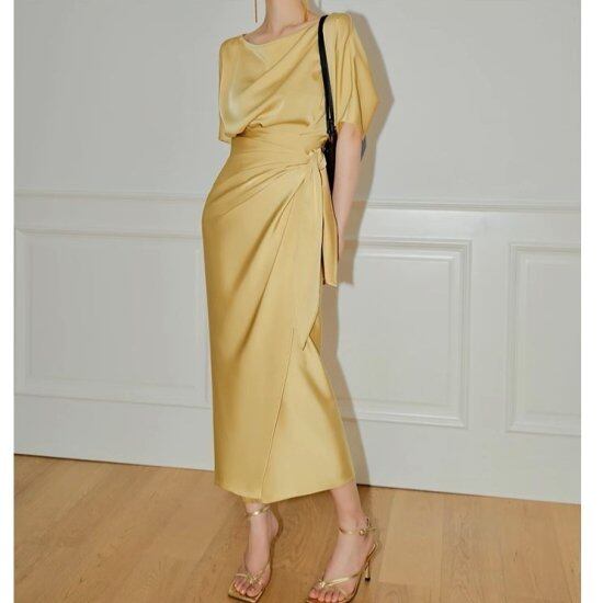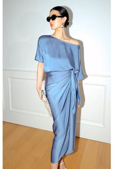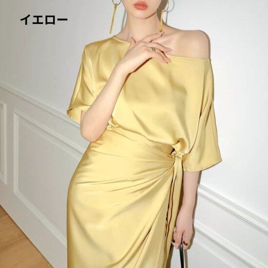 パーティードレス レディース アシンメトリー ワンショルダー ワンピース ラグランスリーブ 半袖 五分袖 光沢 ウエストマーク ドレープ 2color エレガント 結婚式 披露宴 謝恩会 おしゃれ