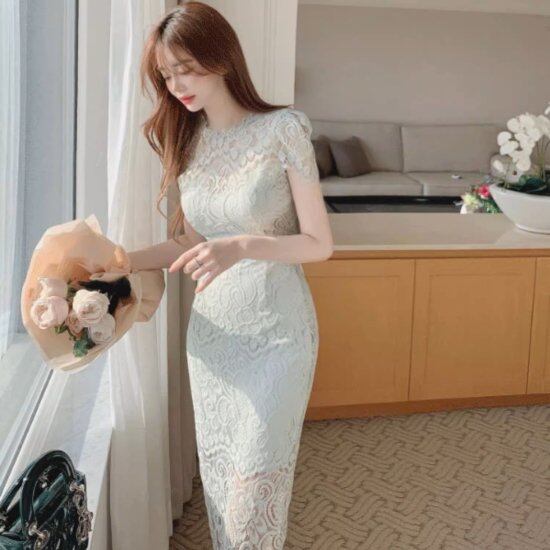 パーティードレス レディース レースワンピース 半袖 ラウンドネック タイト スリム バックリボン 背中あき ミモレ丈 ロング丈 スリット エレガント 結婚式 披露宴 謝恩会 二次会 おしゃれ