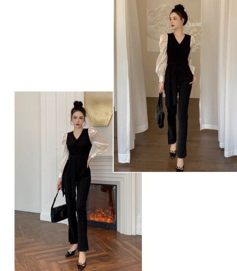 パンツドレス レディース オールインワン Vネック 長袖 スリム パフスリーブ ボリューム袖 クロップドパンツ ジャンプスーツ パーティードレス エレガント シック 結婚式 披露宴 謝恩会 おしゃれ