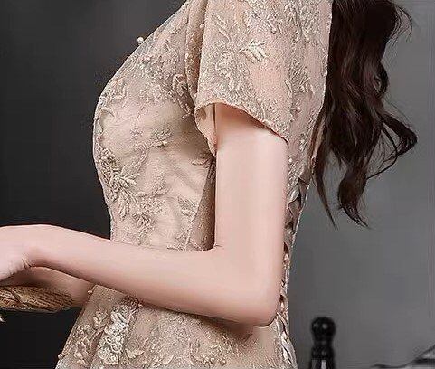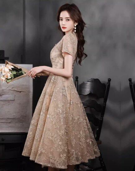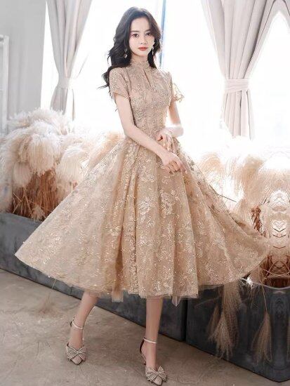 パーティードレス レディース フレアワンピース 半袖 刺繍 ビジュー スタンドカラー Aライン ミモレ丈 ロング丈 透け感 きれいめ エレガント 上品 結婚式 披露宴 謝恩会 パーティー おしゃれ
