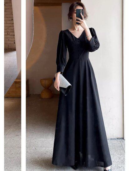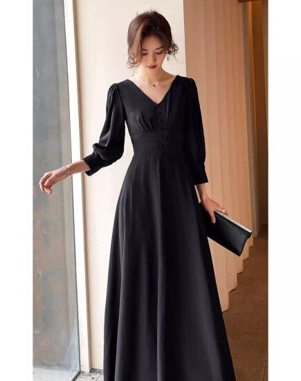 パーティードレス レディース フレア ワンピース Vネック Aライン 長袖 パフスリーブ ボタン ハイウエスト ロング マキシ エレガント 結婚式 演奏会 披露宴 謝恩会 イブニングドレス おしゃれ