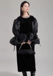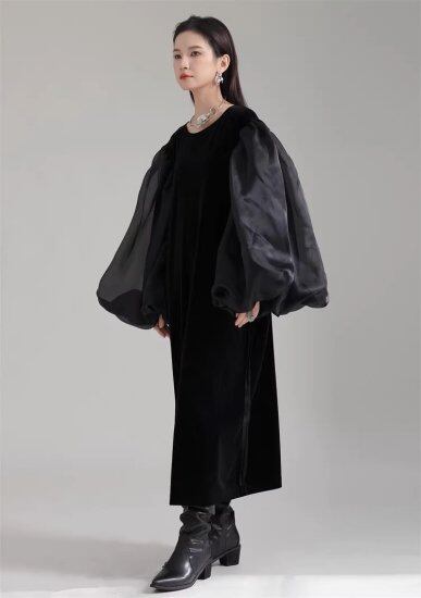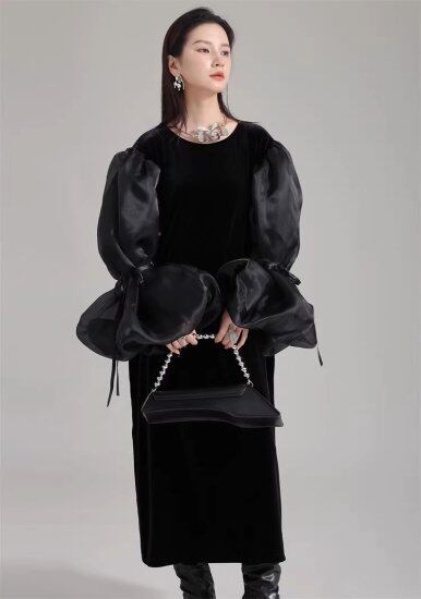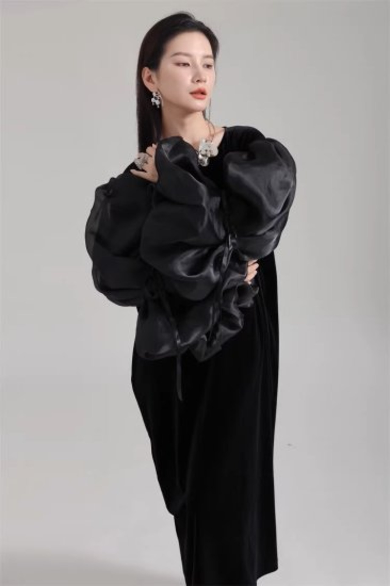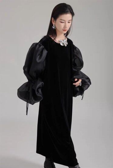 パーティードレス レディース ロングワンピース バルーンスリーブ 長袖 パフスリーブ ボリューム袖 ロング マキシ 個性的 ユニーク モード レトロ クラシカル ラウンドネック リボン おしゃれ
