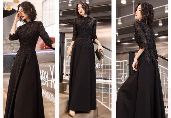 パーティードレス レディース 演奏会ドレス 五分袖 長袖 スタンドカラー ハイネック レース Aライン シック クラシカル レトロ フレア 上品 結婚式 披露宴 謝恩会 イブニングドレス おしゃれ