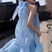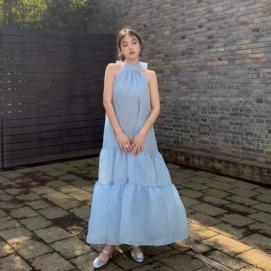 ふんわりとしたティアードスカートをホルターネックが引き締めます♪