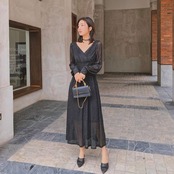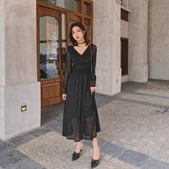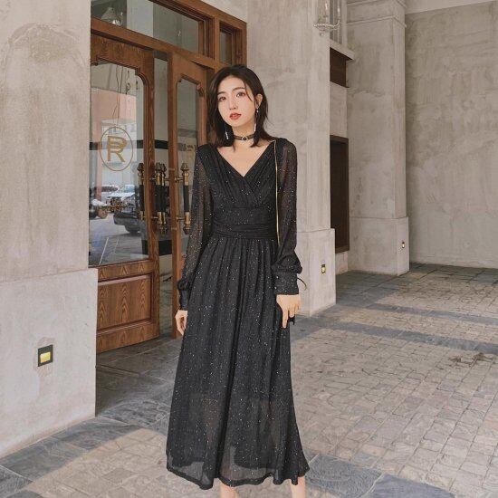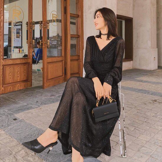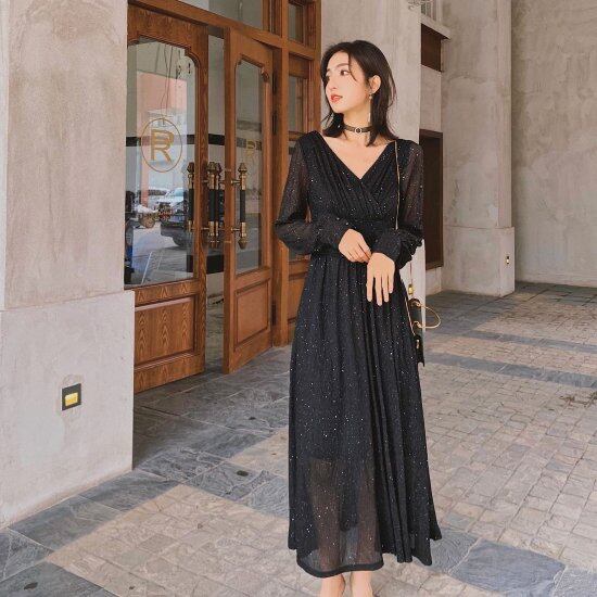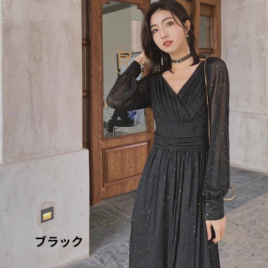 パーティードレス レディースVネック 長袖 カシュクール ワンピース キラキラ ハイウエスト ロング マキシ 3color 華やか エレガント 結婚式 演奏会 披露宴 謝恩会 パーティー おしゃれ