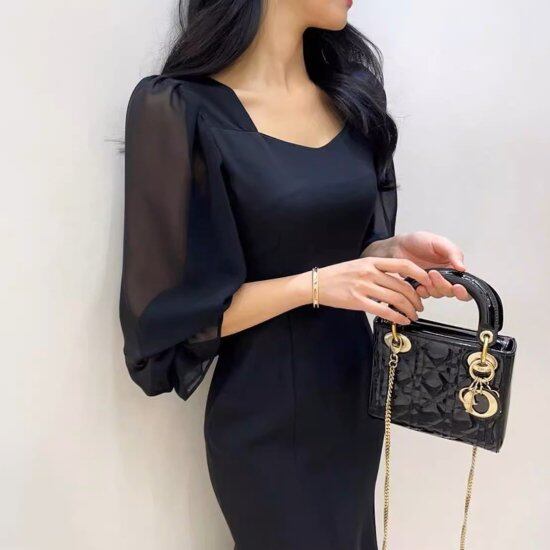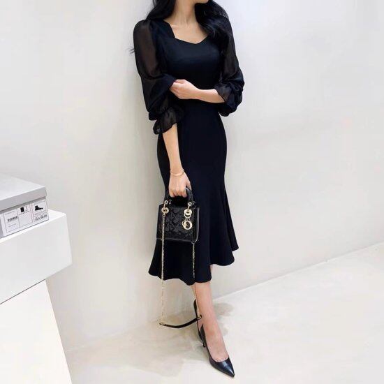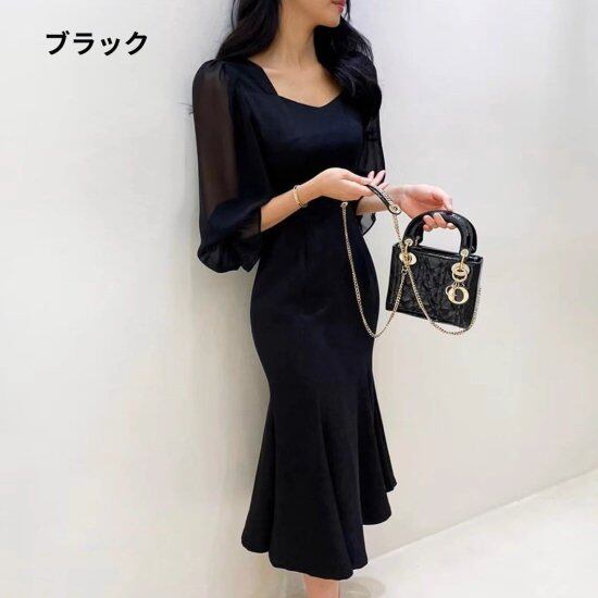 パーティードレス レディース マーメイド 長袖 パフスリーブ タイト フィッシュテール ロングワンピース レトロ クラシカル 上品 2color 結婚式 演奏会 披露宴 謝恩会 二次会 おしゃれ