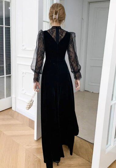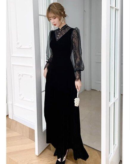 パーティードレス レディース 演奏会ドレス ベルベット ロングドレス 長袖 レース袖 シアースリーブ スタンドカラー ロング マキシ エレガント 結婚式 謝恩会 披露宴 イブニングドレス おしゃれ