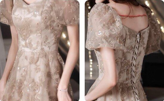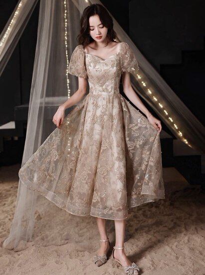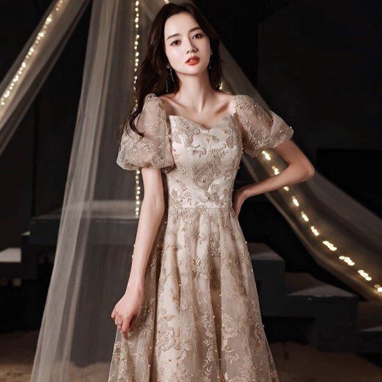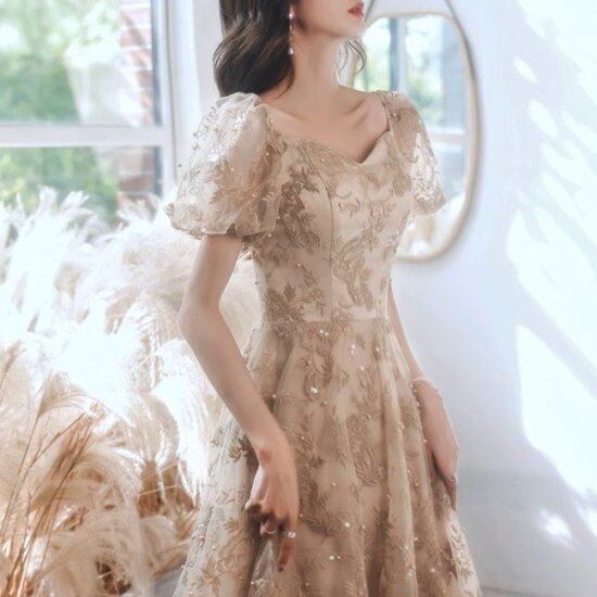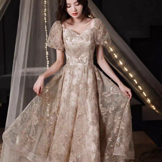 パーティードレス レディース 演奏会ドレス ワンピース 半袖 パフスリーブ ボリューム袖 レース 刺繍 パール スクエアネック ハートネック 光沢 エレガント 結婚式 披露宴 謝恩会 おしゃれ