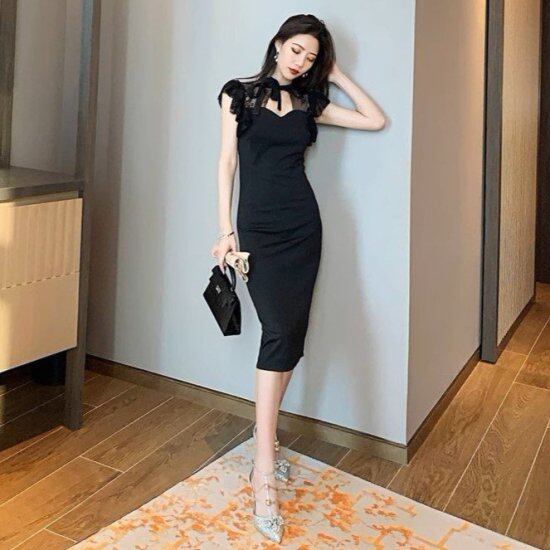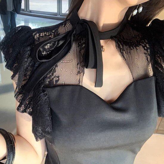 パーティードレス レディース タイトワンピース レース袖 フレンチスリーブ バックレース シアー シースルー リボン Vネック エレガント 結婚式 演奏会 披露宴 謝恩会 パーティー おしゃれ