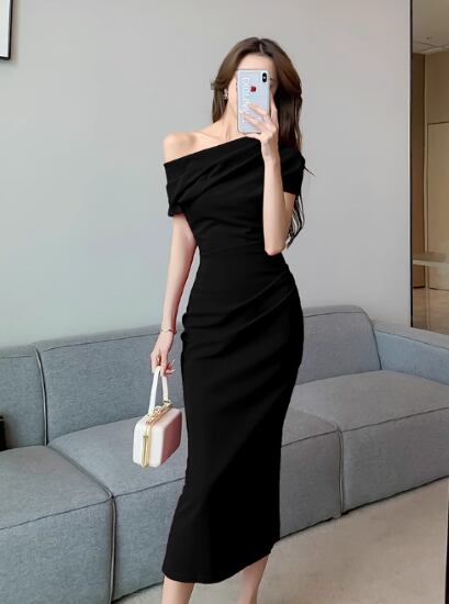 パーティードレス レディース 演奏会ドレス 結婚式ドレス ワンピースドレス シンプル ミディドレス ワンショルダー 肩出し セクシー きれいめ エレガント お呼ばれ フォーマル パーティー 二次会