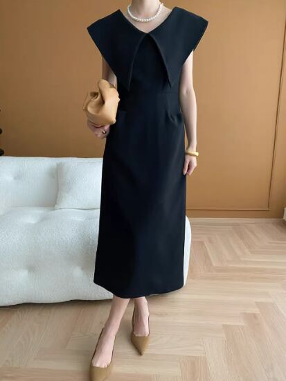パーティードレス レディース 演奏会ドレス 結婚式ドレス ワンピースドレス ミディドレス ビッグカラー 大きめ襟 Vネック シンプル ノースリーブ きれいめ エレガント お呼ばれ フォーマル 女性