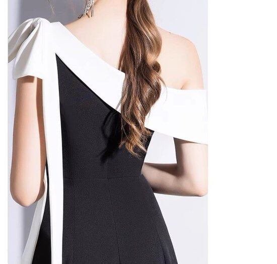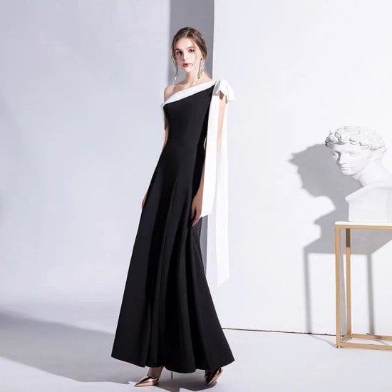 パーティードレス レディース ノースリーブ ワンショルダー リボン バイカラー ロングドレス マキシ Aライン ツートーン エレガント 肩リボン 結婚式 演奏会 披露宴 謝恩会 ドレス おしゃれ