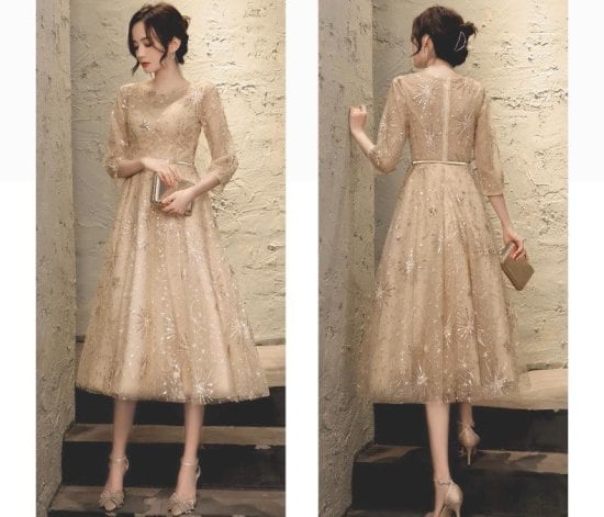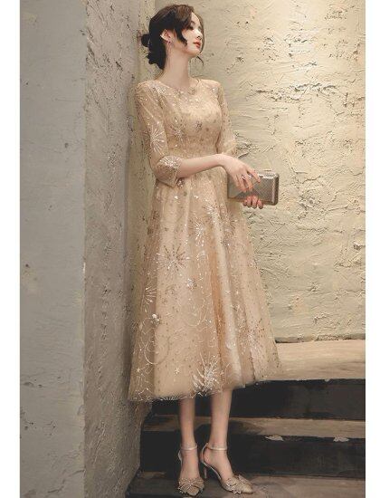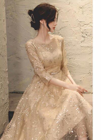 パーティードレス レディース シアー ワンピース 刺繍 星 月 七分袖 ラウンドネック Aライン ミモレ ロング ビーズ スパンコール エレガント 華やか 結婚式 演奏会 謝恩会 ドレス おしゃれ
