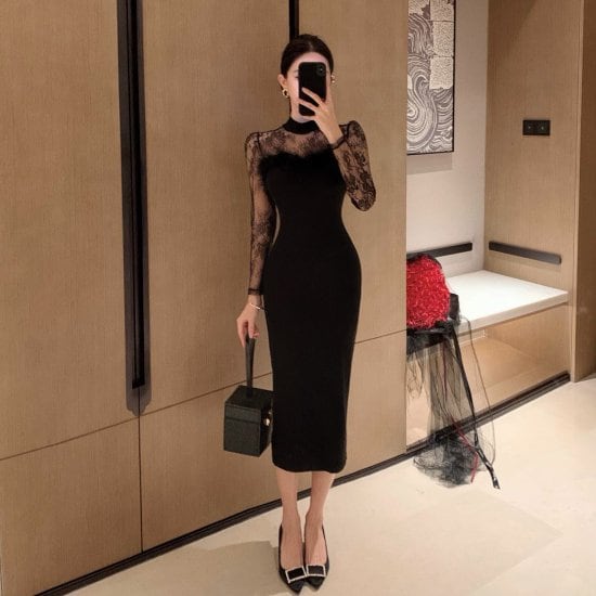 ブラックレースがエレガントなワンピースドレス。