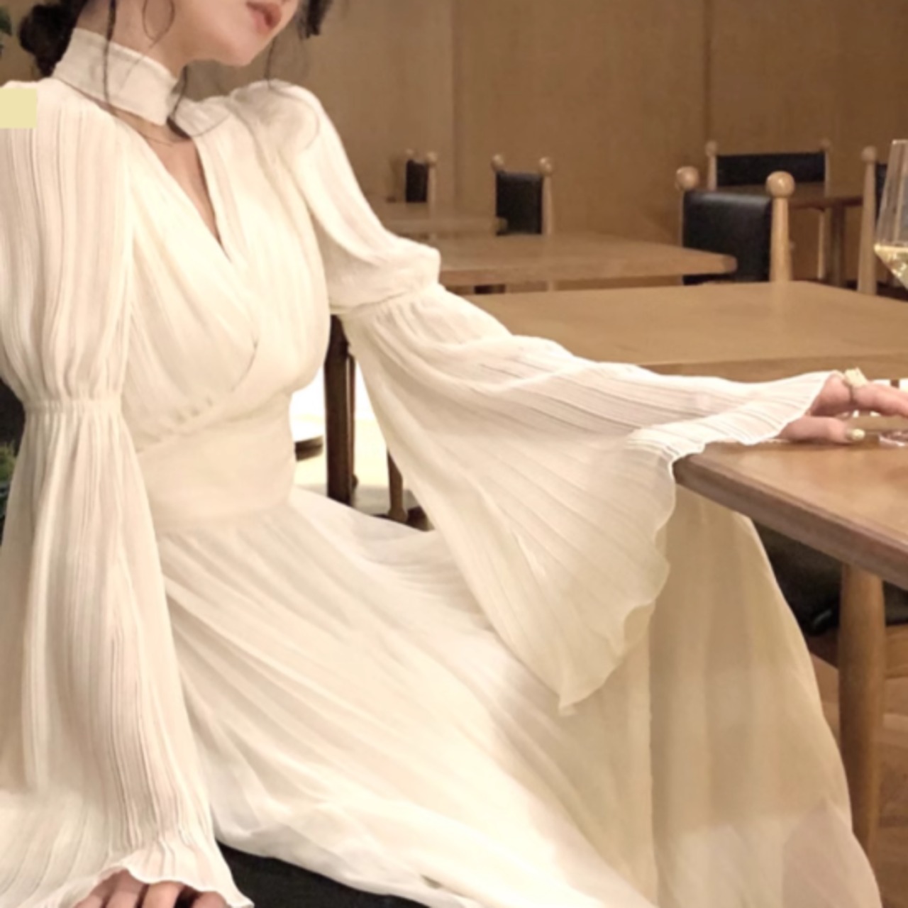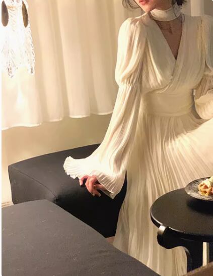 パーティードレス レディース Vネック 長袖 プリーツ カシュクール フレアスリーブ パフスリーブ ロング マキシ ドレス レトロ クラシカル エレガント 2color 演奏会 結婚式 おしゃれ